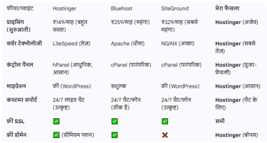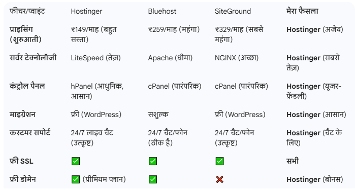 जब मैंने अपनी होस्टिंग रिसर्च की थी, तो मैं भी Bluehost और SiteGround जैसे बड़े नामों के बीच फंसा हुआ था। लेकिन गहन तुलना के बाद, Hostinger मेरे लिए विजेता बनकर उभरा। यहाँ कुछ कारण दिए गए हैं: