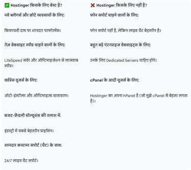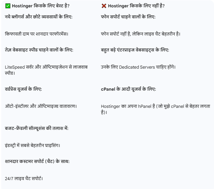 अगर आप मेरी तरह व्यस्त हैं और तुरंत जानना चाहते हैं कि Hostinger आपके लिए है या नहीं, तो यह सारांश देखें। मेरा अनुभव कहता है कि अगर आप नीचे दी गई किसी भी कैटेगरी में आते हैं, तो Hostinger आपके लिए गेम-चेंजर साबित होगा: